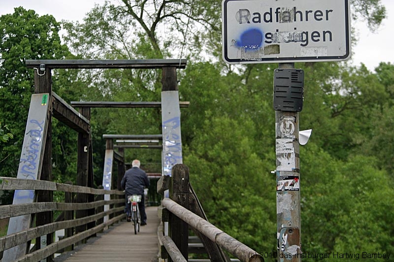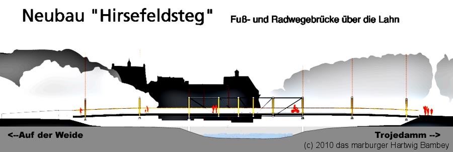 Marburg 31.5.2010 (yb) Zum Beginn der Bauarbeiten für den neuen Hirsefeldsteg ist am Wochenanfang die Baustelle eingerichtet worden. Die bauausführende Firma hat Büro- und Werkzeug-Container aufgestellt und einen Bagger antransportiert. Damit wird bereits sichtbar, dass einiges an Aushub und Erdbewegungen zu erwarten sein wird. Die Baustelle wird von der Innenstadtseite von der Straße „Auf der Weide“ angedient.