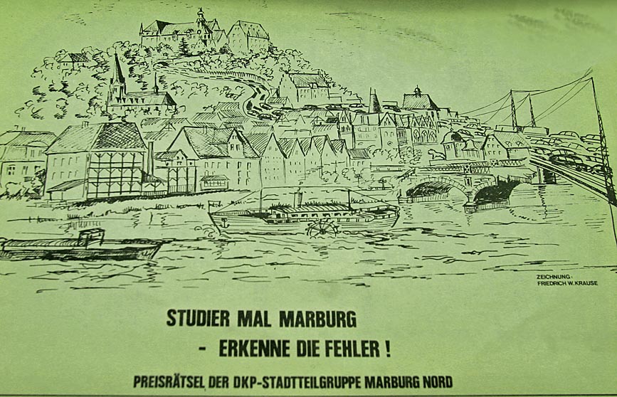 Doch spätestens vor drei, vier Jahrzehnten tauchen politische Auseinandersetzungen auf. Stadtentwicklung, Verkehrsführung geraten in politische Auseinandersetzungen. Auch dazu gibt es visuelle Zeugnisse. Insofern gelingt der Ausstellung in ihrer Offenheit eine Anregung zur Auseinandersetzung jenseits von Verklärung. Marburg möchte (man) wieder an die Lahn. Und inzwischen schreibt man Fluß mit ss.
