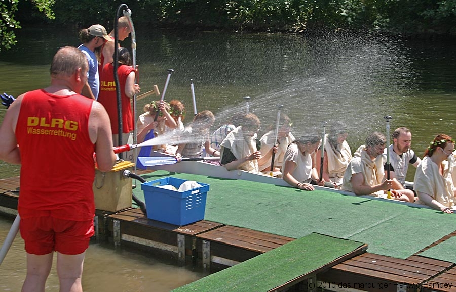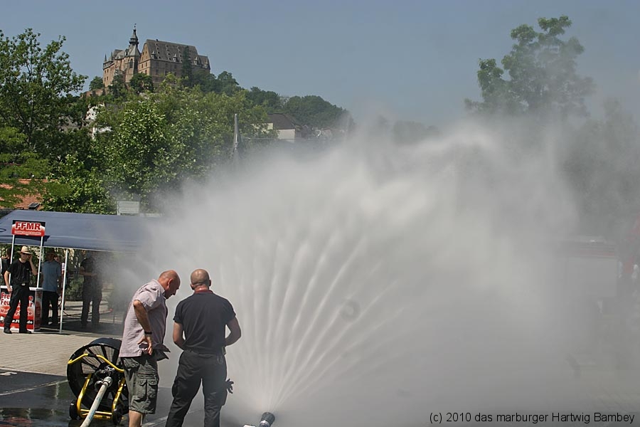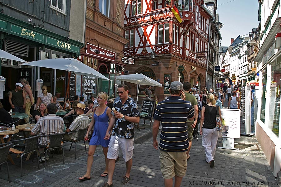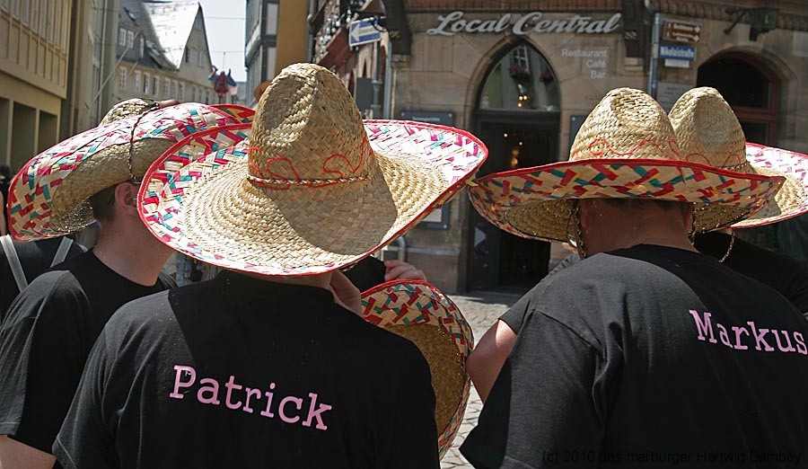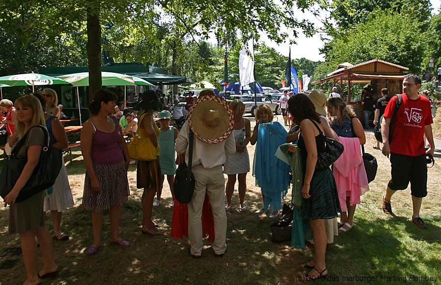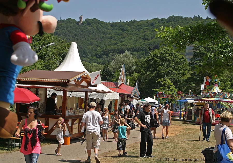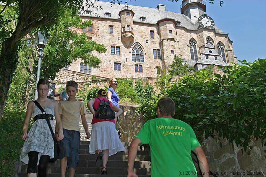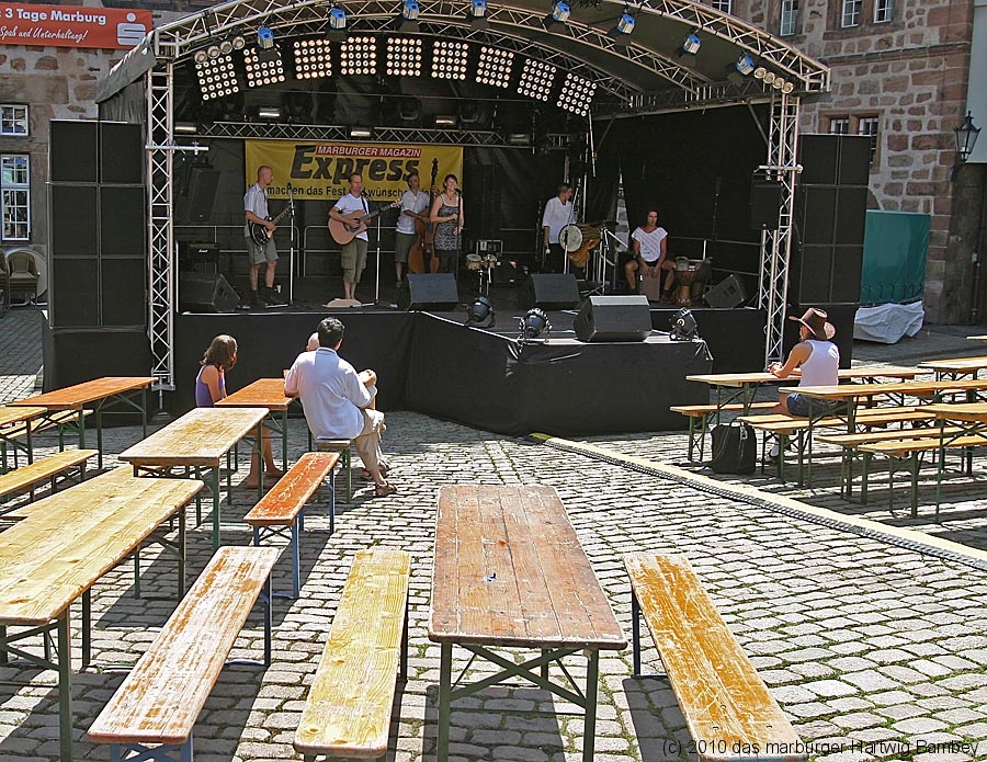 marburg 13.7.2010 (yb) es ist viel geschwitzt worden an den drei tagen und es ist viel geschrieben worden, dass zu viel des guten eben nicht mehr gut ist und dass die leute deswegen weggeblieben sind und die, die da waren,  tapfer sein mussten. klar dass schattenplätze genauso gefragt waren, wie flüssigkeit zum trinken. noch besser war wasser zum abkühlen, wo es welches gab, natürlich unten an der lahn, aber auch oben am schloss. überall waren leute unterwegs, tagsüber deutlich weniger und abends besonders an den bühnen dann viele. drei stimmen sind gut aber nicht gleich dreimal als karaoke, wie  einer geschrieben hat. jetzt reichts mit den worten – ebbes noch in bildern aus drei stunden am mittleren der drei tage.