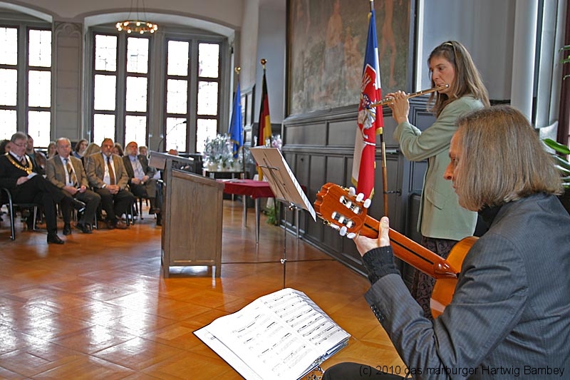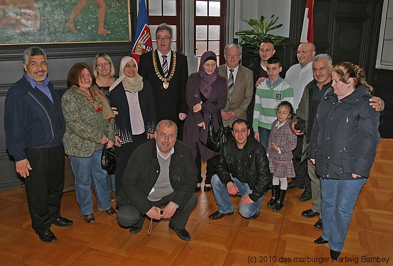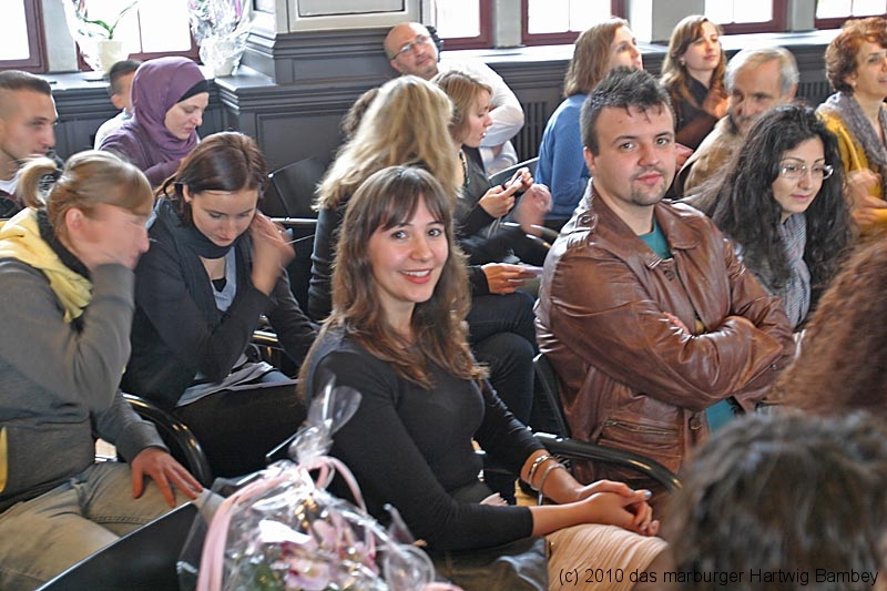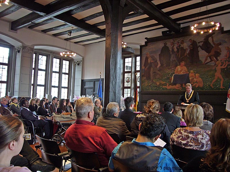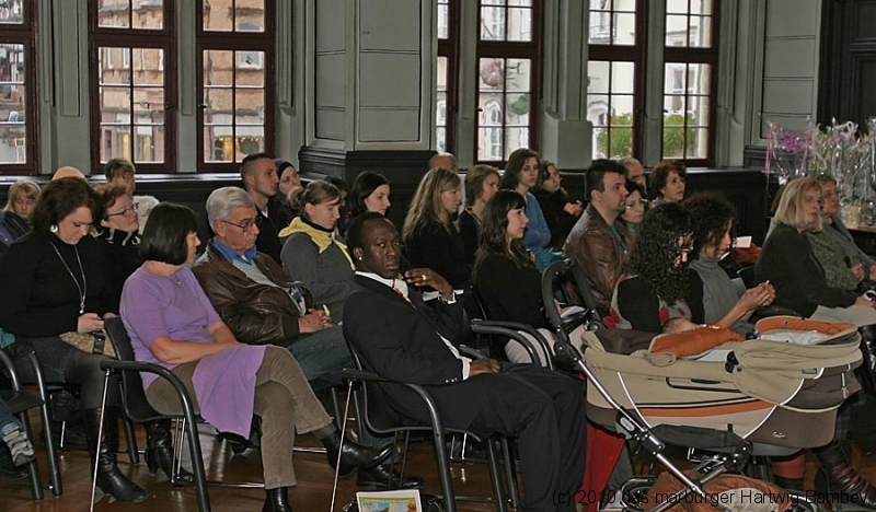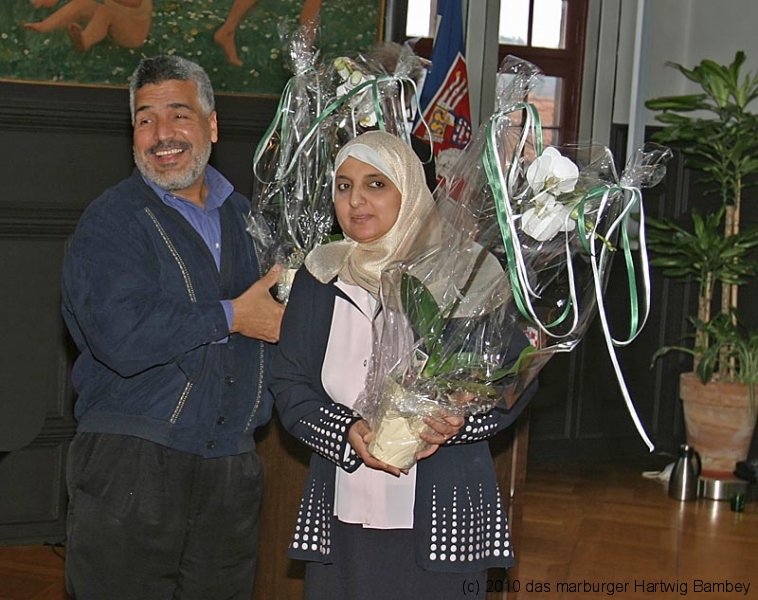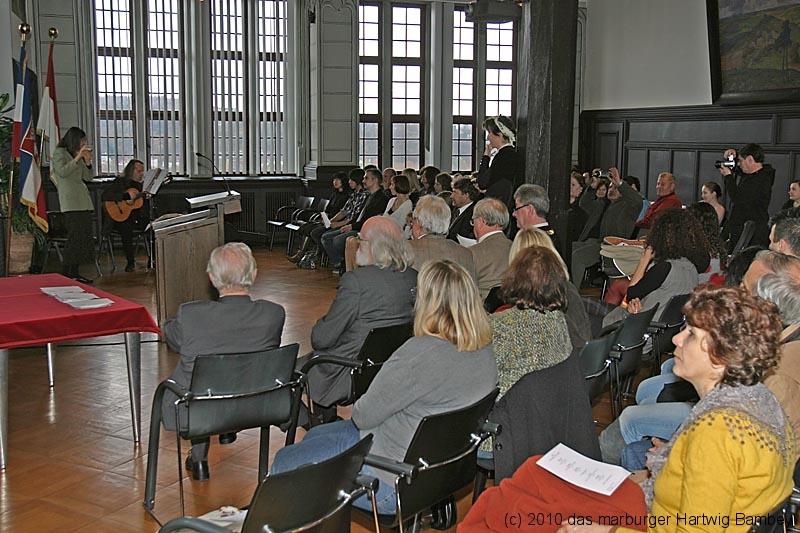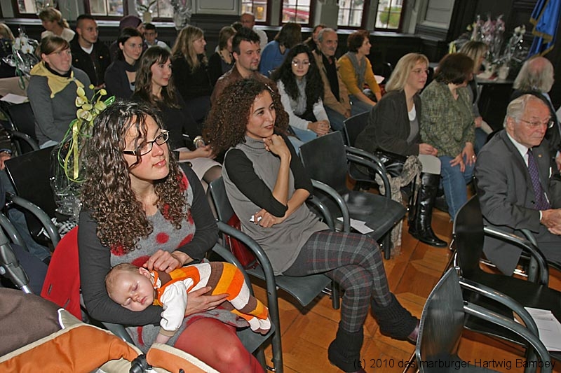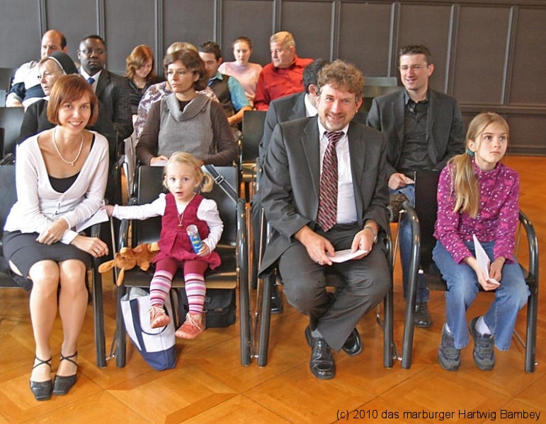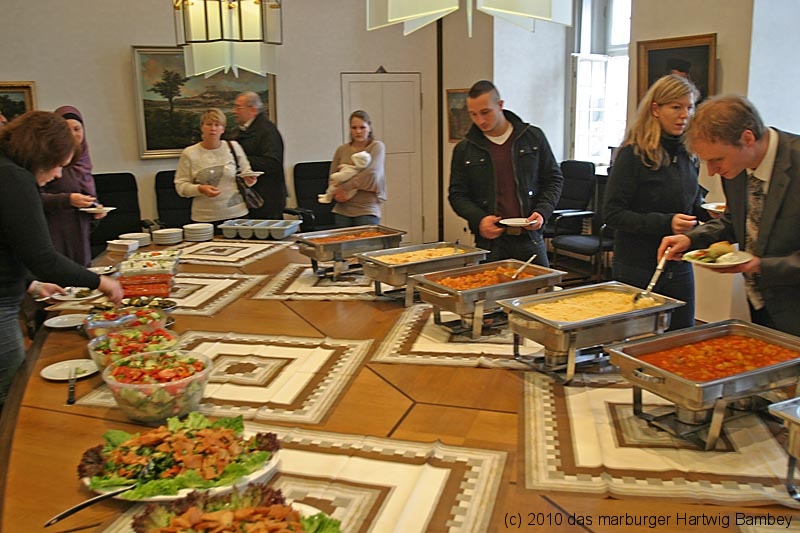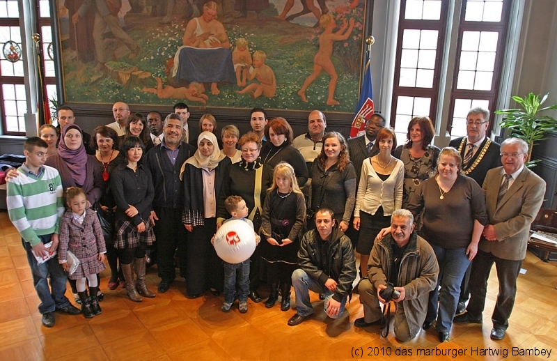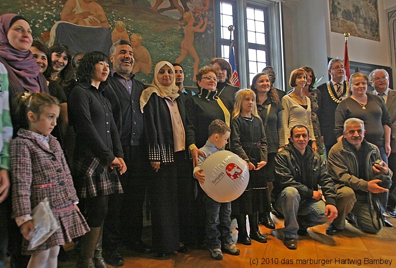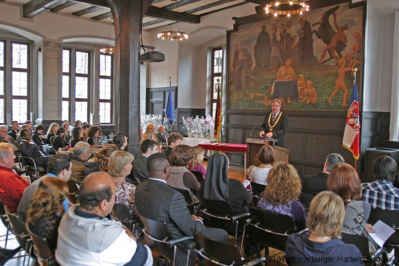 Marburg 7.11.2011 (yb) Im Jahr 2010 hat Marburg und damit die gesamte Republik 130 Neubürger auf dem Weg der Einbürgerung gewonnen. Dass es sich bei und mit diesen 130 frischgebackenen Deutschen Staatsbürgern um einen wirklichen Gewinn handelt, dafür war das Einbürgerungsfest im Rathaus bester Beleg. Etwa 20 der Neubürger waren gekommen und es war einfach – man konnte und brauchte die Menschen einfach nur erleben. Ob zurückhaltend oder vor Freude strahlend, ob unauffällig oder festlich gekleidet, es ließen sich verschiedene Persönlichkeiten, Eigenarten und Umgangsweisen wahrnehmen. Gemeinsam sind diesen neuen Marburger Bürgerinnen und Bürgern ihre positive Einstellung zu dieser Republik, ihrer Kultur und viele Einbringungen aus ihrer Herkunft, Prägung, beruflichen Qualifikationen und offen sympathischen Menschlichkeit. Nach den Worten erst einmal Bilder.
