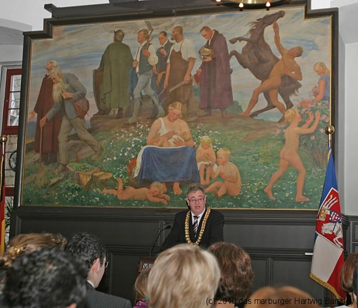 Stattdessen erzählte das Stadtoberhaupt die Geschichte des Rathausgemäldes „Der Weg des Lebens“ von Carl Bantzer, welches die Stirnwand des Rathaussaales ziert. Dieses Gemälde wurde von zwei jüdischen Geschäftsleuten bei dem Marburger Maler für das Rathaus in Auftrag gegeben und gestiftet. Nur wenige Jahre nach seiner Aufhängung im Rathaus in 1930 „wurden die beiden Marburger Bürger mit ihren Familien von den Nazischergen aus der Stadt gejagt“ wie Vaupel sagte. In der Judenverfolgung  und deren ersten Höhepunkt 1938 in Gestalt der  November-Pogrome brannte in Marburg die Synagoge und in Deutschland herrschte das unmenschliche Nazi-Regime.