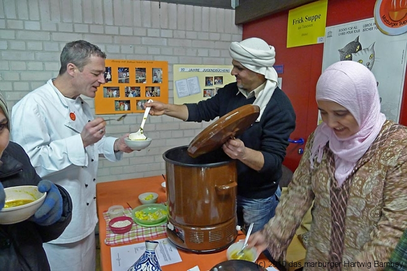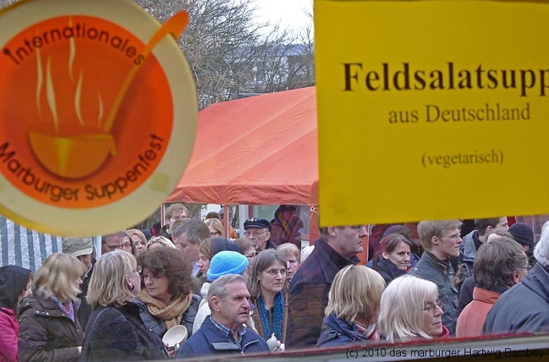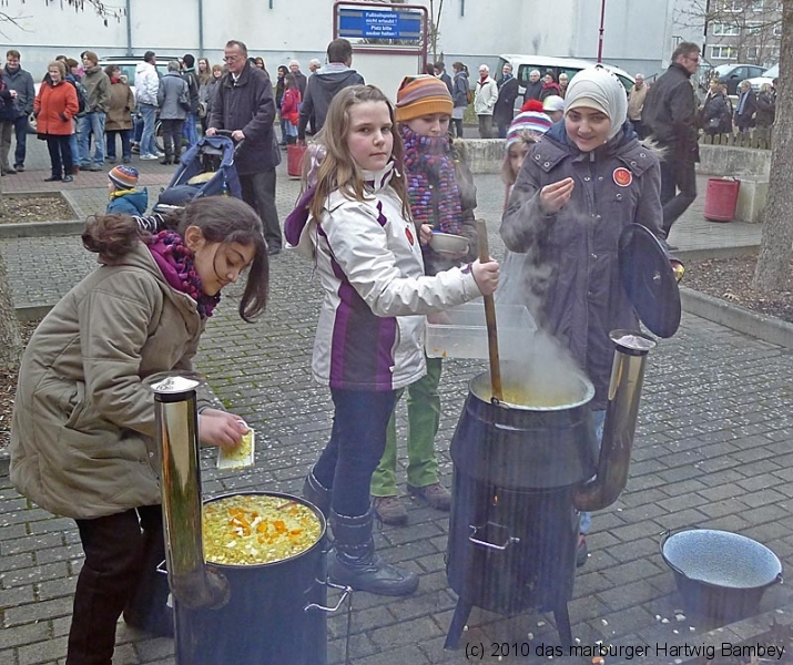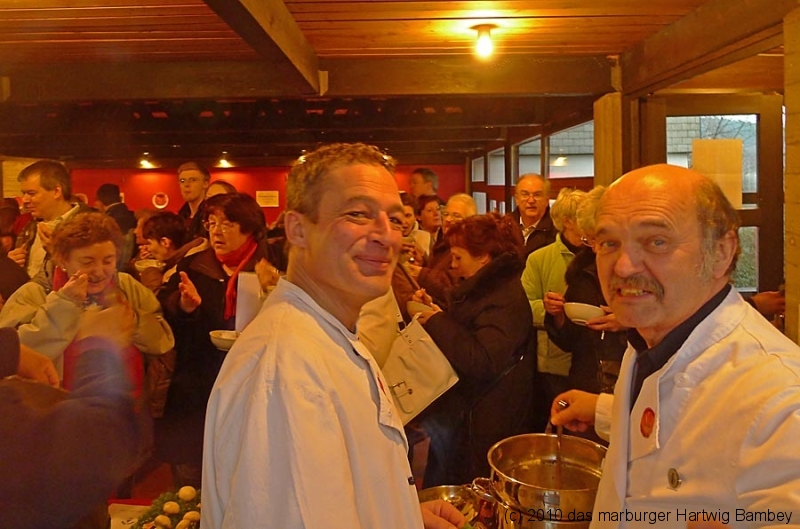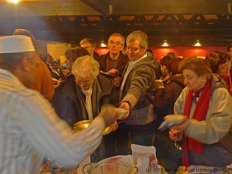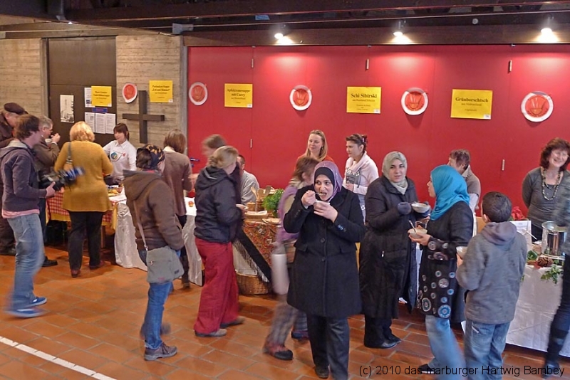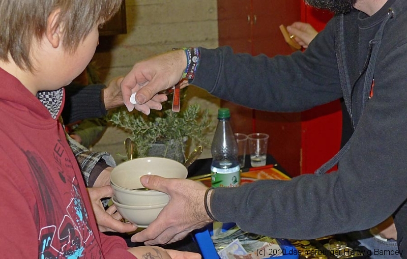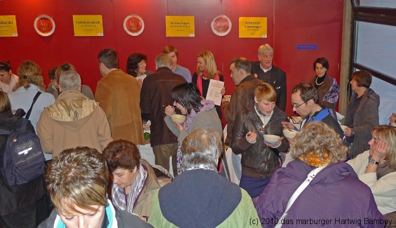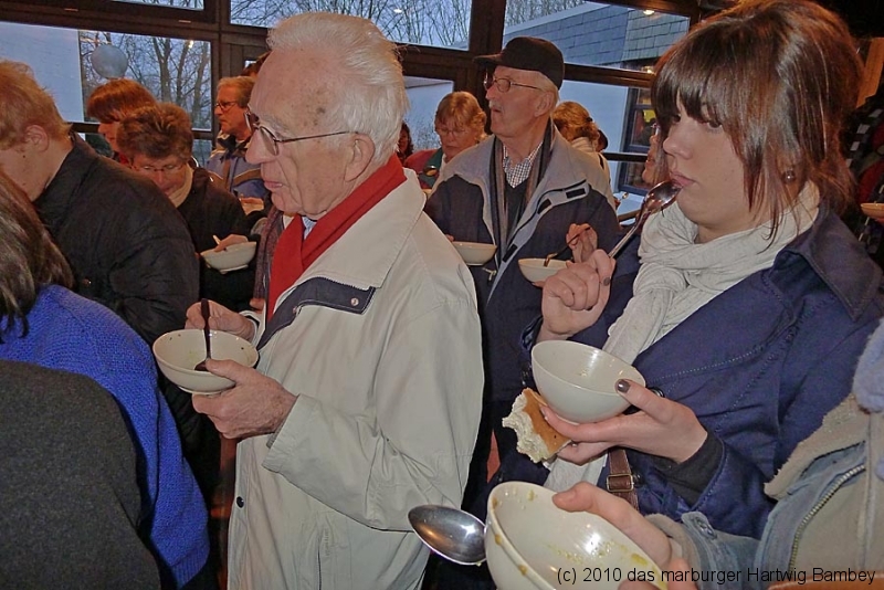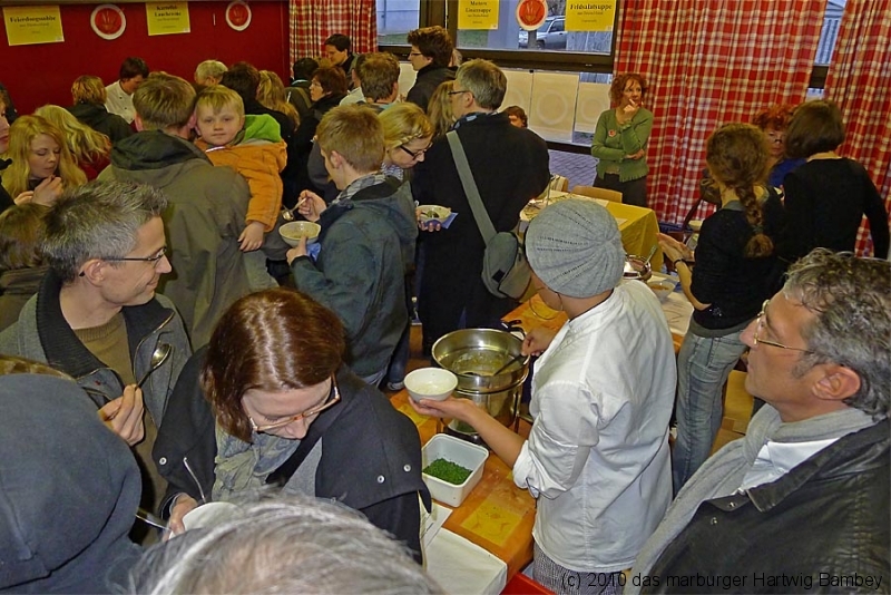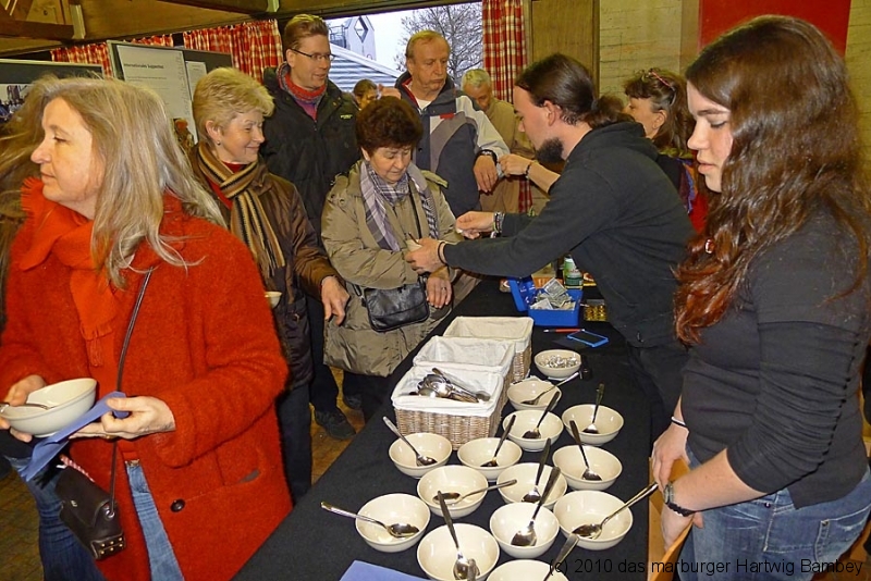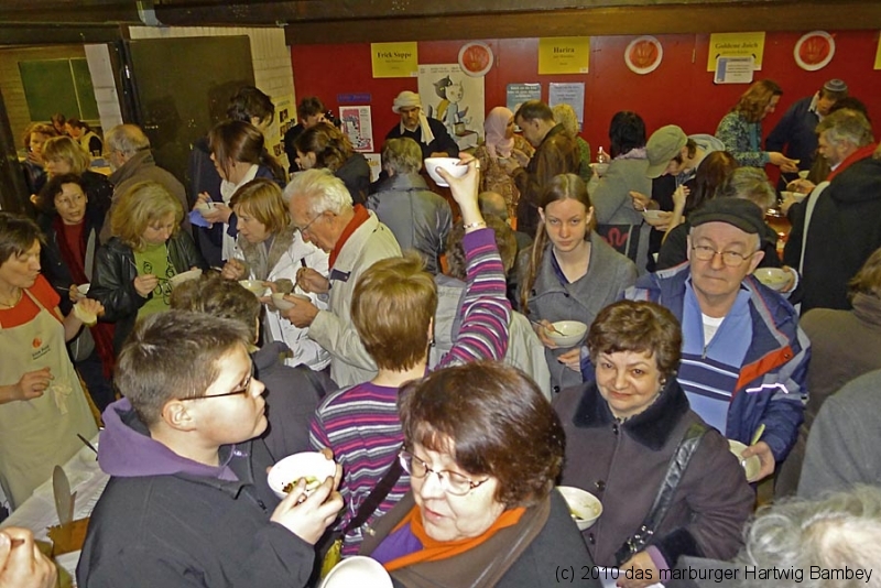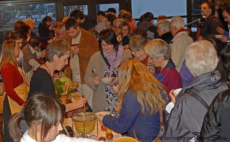 Marburg 27.2.2011 (yb) Auf die Zwölf getroffen und bestens gelaufen ist die sechste Auflage des Suppenfestes am Richtsberg. Die Schlange der auf Einlass Wartenden überschritt eine Länge von 100 Metern. Doch die Leute nahmen es mit Geduld und nutzen die Zeit für ein Schwätzchen. Dann wurde es schlagartig voll im oekumenischen Gemeidezentrum. Rappelvoll waren Flure, Gänge und bestuhlte Nebenräume. Vor allem stauten sich die vielen jüngeren und älteren Besucher, darunter zahlreiche Stammgäste, natürlich an den Suppentheken. Diese waren wohlweislich strategisch verteilt aufgebaut, zugleich galt es weit über 50 über Suppenköchinnen und -köchen mit mehr als 25 Suppenangeboten ordentlichen Platz zu bieten. Als nach einer Stunde die ersten Besucher sich schon wieder mit mehr oder weniger gefüllten Bäuchen und angeregten Geschmackssinnen auf den Nachhauseweg machten, warteten später Gekommene immer noch auf Einlass. So waren denn die ersten Suppen schon aus, als manch Eine(r) endlich, mit Suppenschüssel und Löffel bewehrt, den Rundgang beginnen konnte. Prächtige Stimmung, alle gut drauf, ob SPD-Bundestagsabgeordneter, CDU-Oberbürgermeisterkandidat, Gewerkschaftsekretär, Mitarbeiter von Sozialinitiativen, Leute vom Richtsberg mit Kopftüchern und Vollbärten oder von auswärts Angereiste. Multi-Kulti, gelöste Stimmung, dufte Leute. Was sollen noch Worte, wo es davon Fotos gibt…
