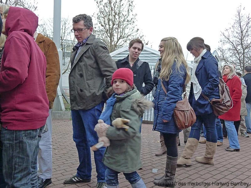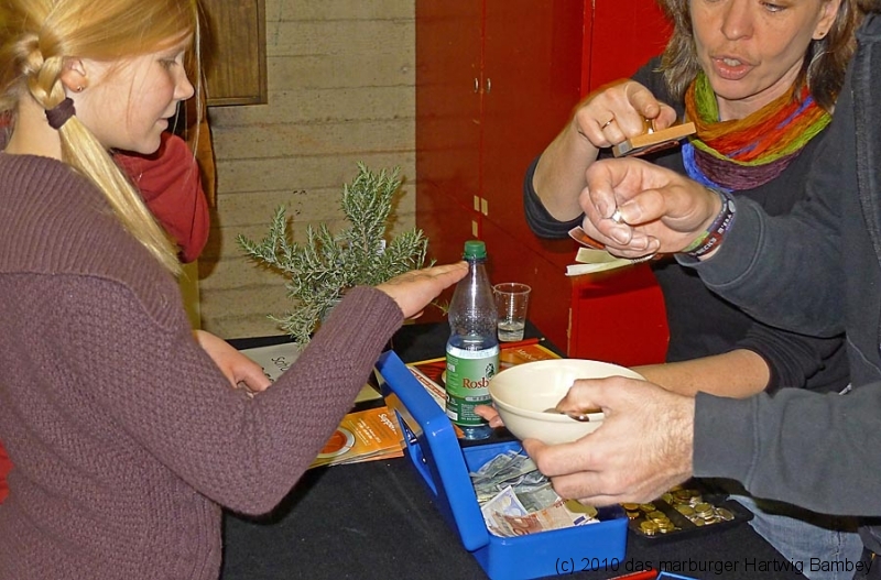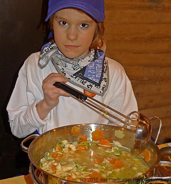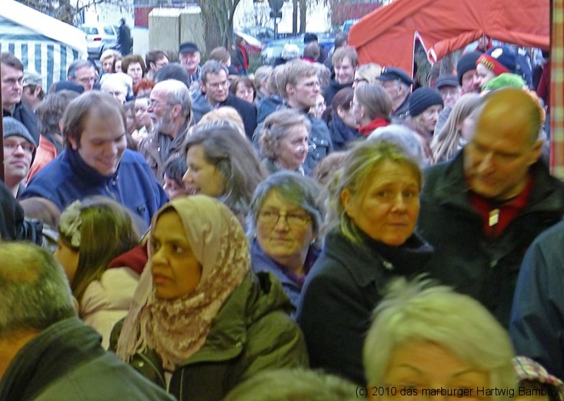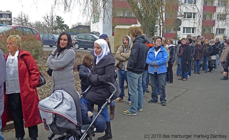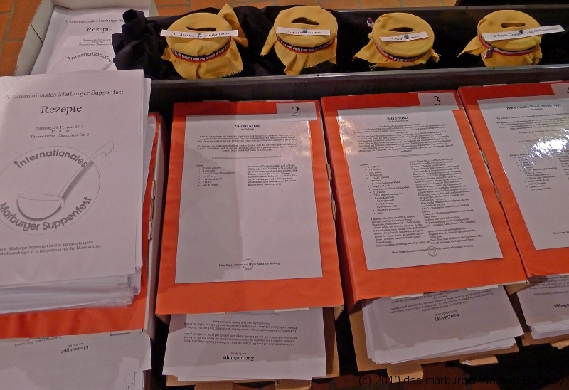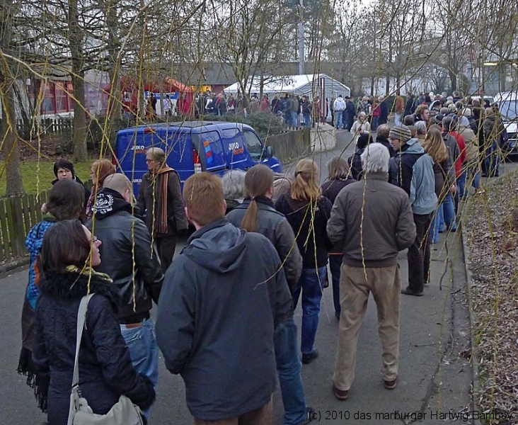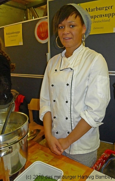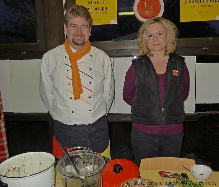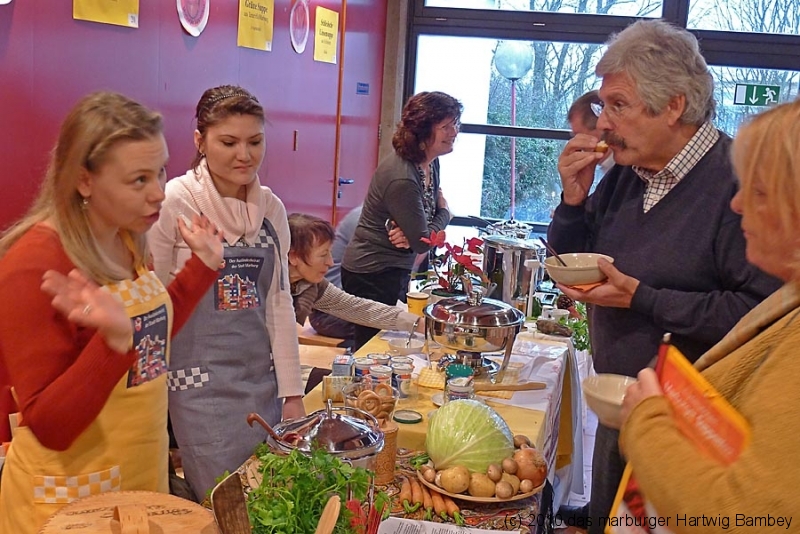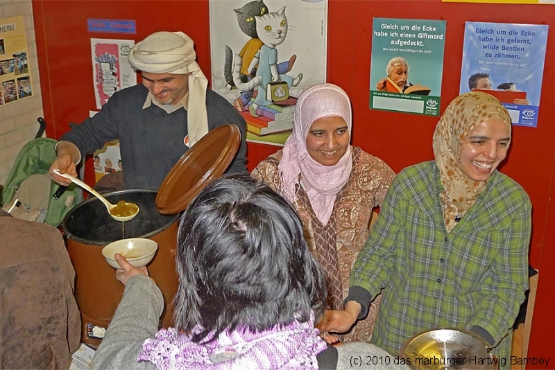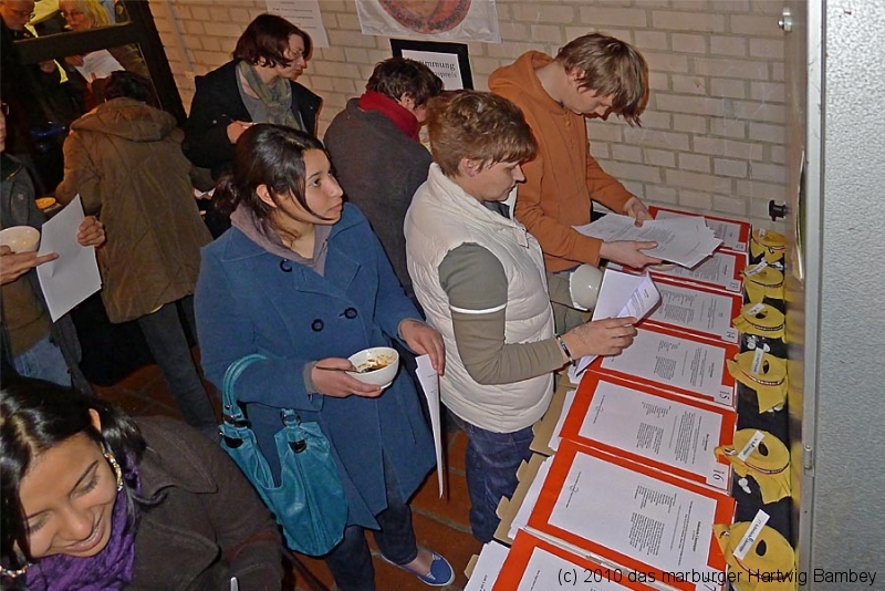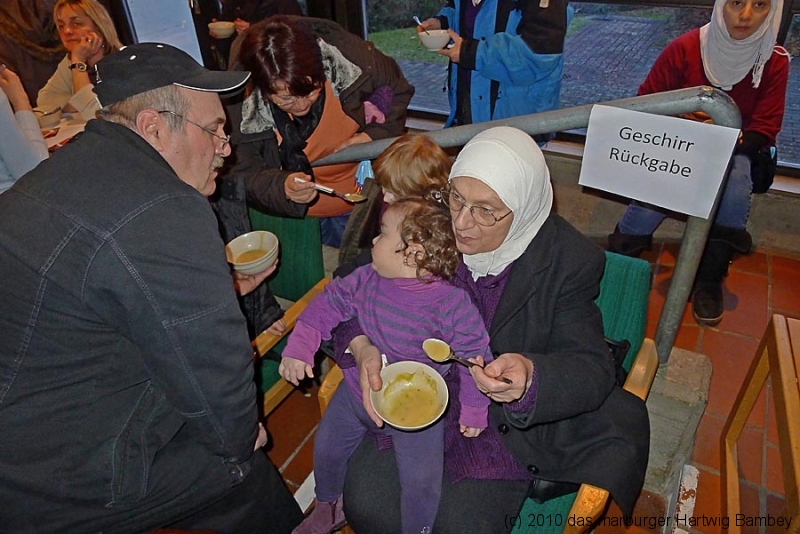 Marburg 27.2.2011 (yb) Auf die Zwölf getroffen und bestens gelaufen ist die sechste Auflage des Suppenfestes am Richtsberg. Die Schlange der auf Einlass Wartenden überschritt eine Länge von 100 Metern. Doch die Leute nahmen es mit Geduld und nutzen die Zeit für ein Schwätzchen. Dann wurde es schlagartig voll im oekumenischen Gemeidezentrum. Rappelvoll waren Flure, Gänge und bestuhlte Nebenräume. Vor allem stauten sich die vielen jüngeren und älteren Besucher, darunter zahlreiche Stammgäste, natürlich an den Suppentheken. Diese waren wohlweislich strategisch verteilt aufgebaut, zugleich galt es weit über 50 über Suppenköchinnen und -köchen mit mehr als 25 Suppenangeboten ordentlichen Platz zu bieten. Als nach einer Stunde die ersten Besucher sich schon wieder mit mehr oder weniger gefüllten Bäuchen und angeregten Geschmackssinnen auf den Nachhauseweg machten, warteten später Gekommene immer noch auf Einlass. So waren denn die ersten Suppen schon aus, als manch Eine(r) endlich, mit Suppenschüssel und Löffel bewehrt, den Rundgang beginnen konnte. Prächtige Stimmung, alle gut drauf, ob SPD-Bundestagsabgeordneter, CDU-Oberbürgermeisterkandidat, Gewerkschaftsekretär, Mitarbeiter von Sozialinitiativen, Leute vom Richtsberg mit Kopftüchern und Vollbärten oder von auswärts Angereiste. Multi-Kulti, gelöste Stimmung, dufte Leute. Was sollen noch Worte, wo es davon Fotos gibt…