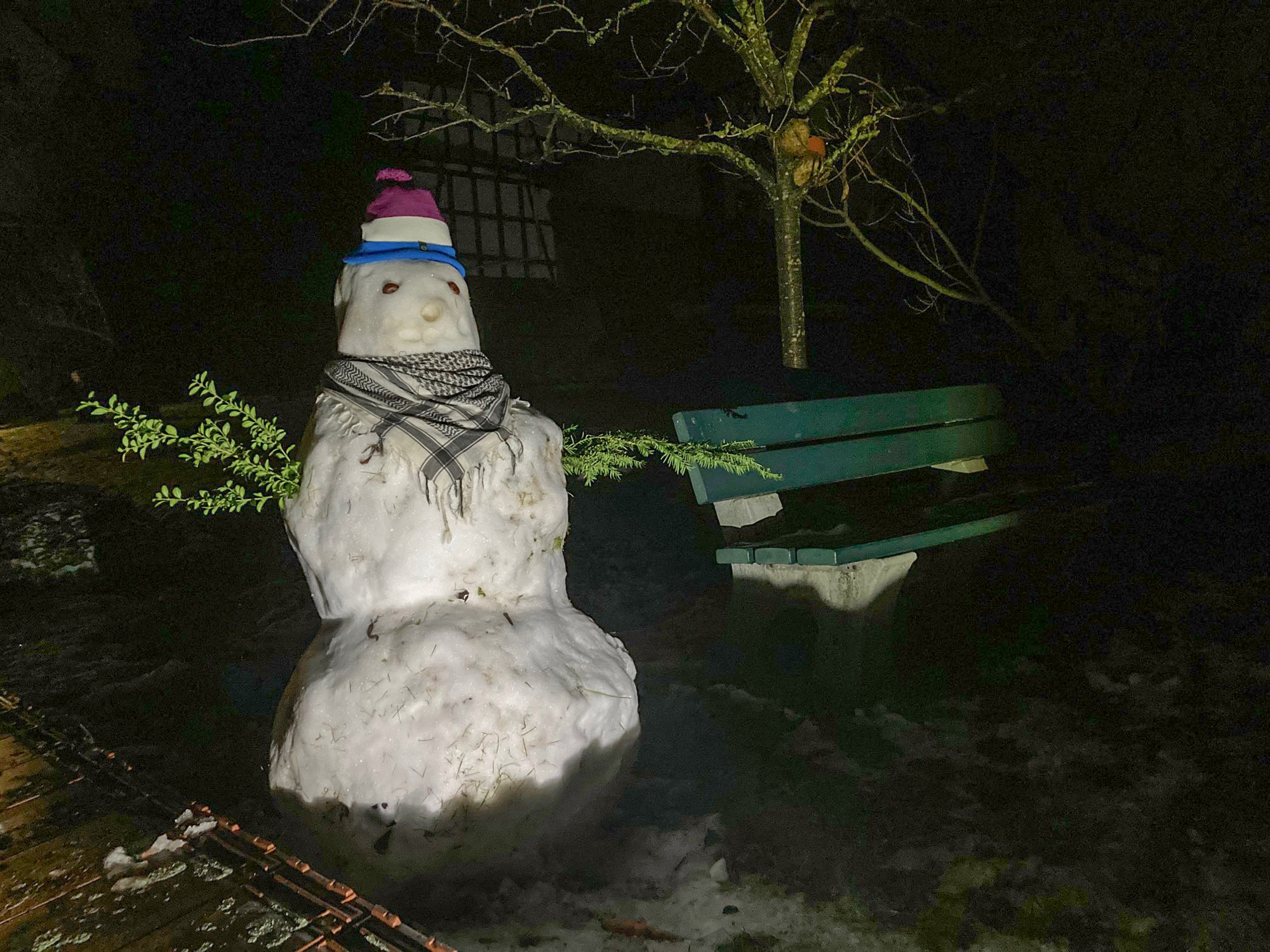 Nikolauswetter in Willingshausen: Erst Schneefall dann Regennacht vor dem Nikolaustag, zwei Schneemänner aus Metall