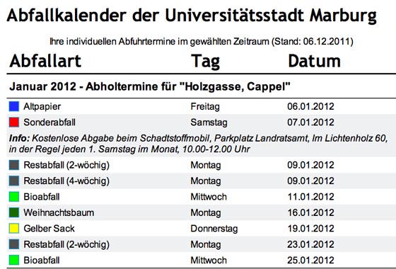 Marburg 29.12.2011 (pm/red) In der Woche vor Weihnachten wurde der neue Abfallkalender 2012 an die Marburger Haushalte verteilt. Neu an diesen Kalendern ist nicht nur die Gestaltung, sondern auch der …
