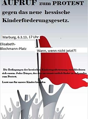 Marburg 3.4.2013 (pm/red) Am kommenden Dienstag, 9. April, findet vor dem Landtag in Wiesbaden eine Demonstration von Erzieherinnen und Eltern gegen das geplante Kinderförderungsgesetz (KiföG) statt. Aufgerufen hierzu hat die …