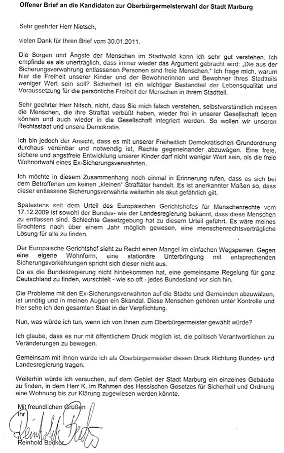 Marburg 17.2.2011 (yb) Nachdem fünf der sechs Kandidaten der anstehenden Oberbürgermeisterwahl den an sie gericheten Offenen Brief der Stadtwaldgemeide in gemeisamen Schreiben beantwortet haben, liegt nunmehr auch die Antwort des …